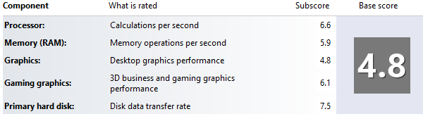 I was surprised to find that the Windows Experience Index (WEI) was so much slower than I’d seen on my wife’s machine: