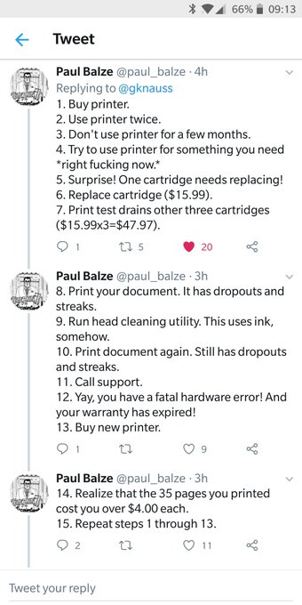 My all-time favourite summary of life with inkjet printers is comedian Olaf Falaffel’s My printer’s being a dick.