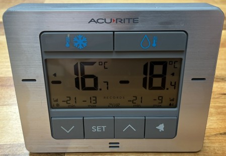 So… I’ve got myself an Acurite freezer thermometer. It’s quite reassuring to see that the freezer is back to normal operations. The alarm has already been helpful. After putting some groceries in the freezer and carefully closing the door I came downstairs an hour later to the alarm going off. It wasn’t obvious to me what was causing the problem, but water was already pooling at the bottom, so warm air was getting in somehow. Thankfully things returned to normal after making sure the door was properly closed (again).