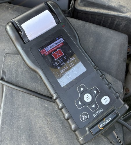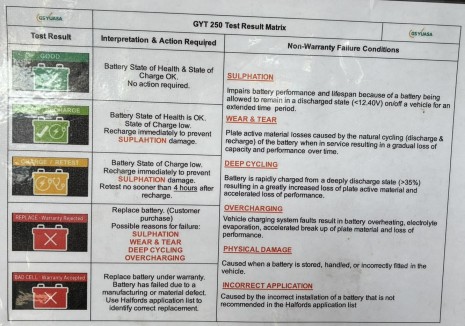 Hardly very confidence inspiring – essentially a list of reasons why they’ll wriggle out of providing a replacement. After some waiting around whilst they served other customers they attached a Yuasa branded testing machine which apparently reported the battery as OK.