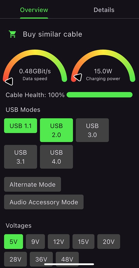 iPhone app showing results for an ordinary cable