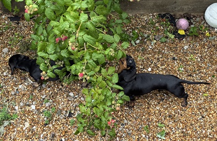 Max and Milo browsing the raspberry bush