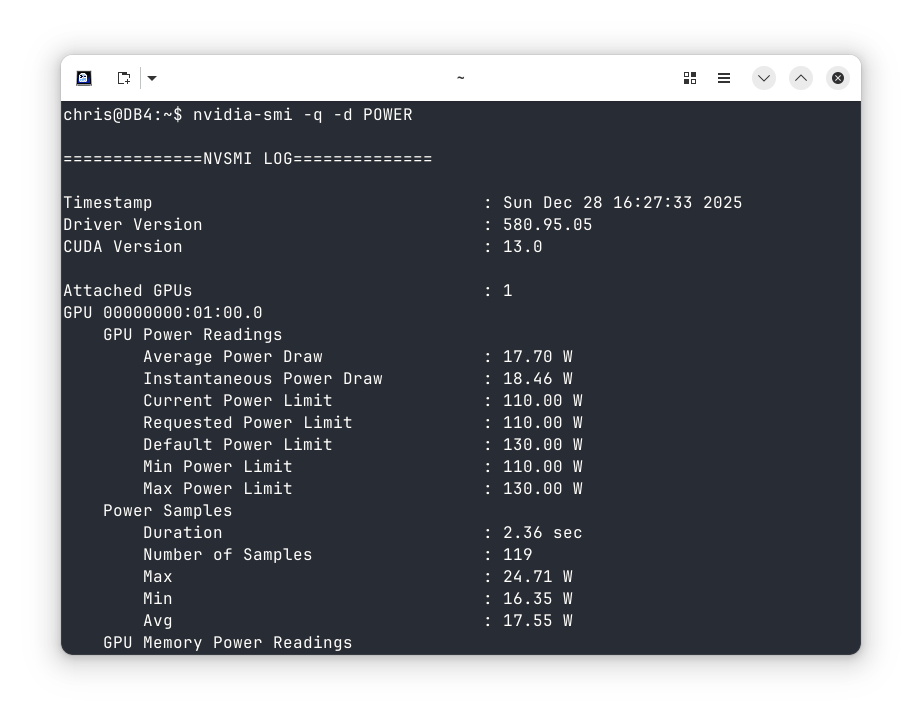 Nvidia have ended Linux support for my ‘Pascal’ GTX 1050 Ti GPU. I’ve been able to fit an RTX 5050 card in its place, though the process was problematic due to driver issues. And I’m still concerned that it can only be limited to 110W when my passive cooling is rated up to 75W.