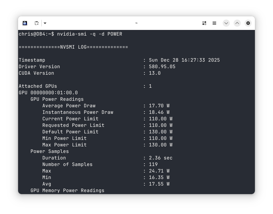 Nvidia have ended Linux support for my ‘Pascal’ GTX 1050 Ti GPU. I’ve been able to fit an RTX 5050 card in its place, though the process was problematic due to driver issues. And I’m still concerned that it can only be limited to 110W when my passive cooling is rated up to 75W.