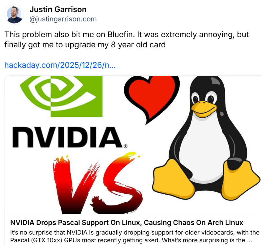 Then I saw Justin Garrison’s post linking to ‘NVIDIA Drops Pascal Support On Linux, Causing Chaos On Arch Linux‘.