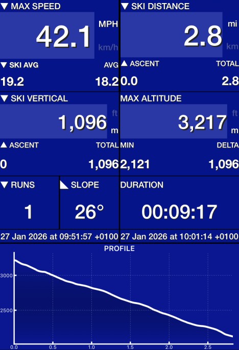 I’ve been using Ski Tracks for a while now, but it let me down a few times on this trip. The whole of my first morning disappeared, with the watch app just vanishing. I also lost an afternoon (and my fastest run of the trip), even though I definitely stopped recording :( Data was reliably getting into Apple Fitness, but sometimes not into the app, which is a shame, and annoying.